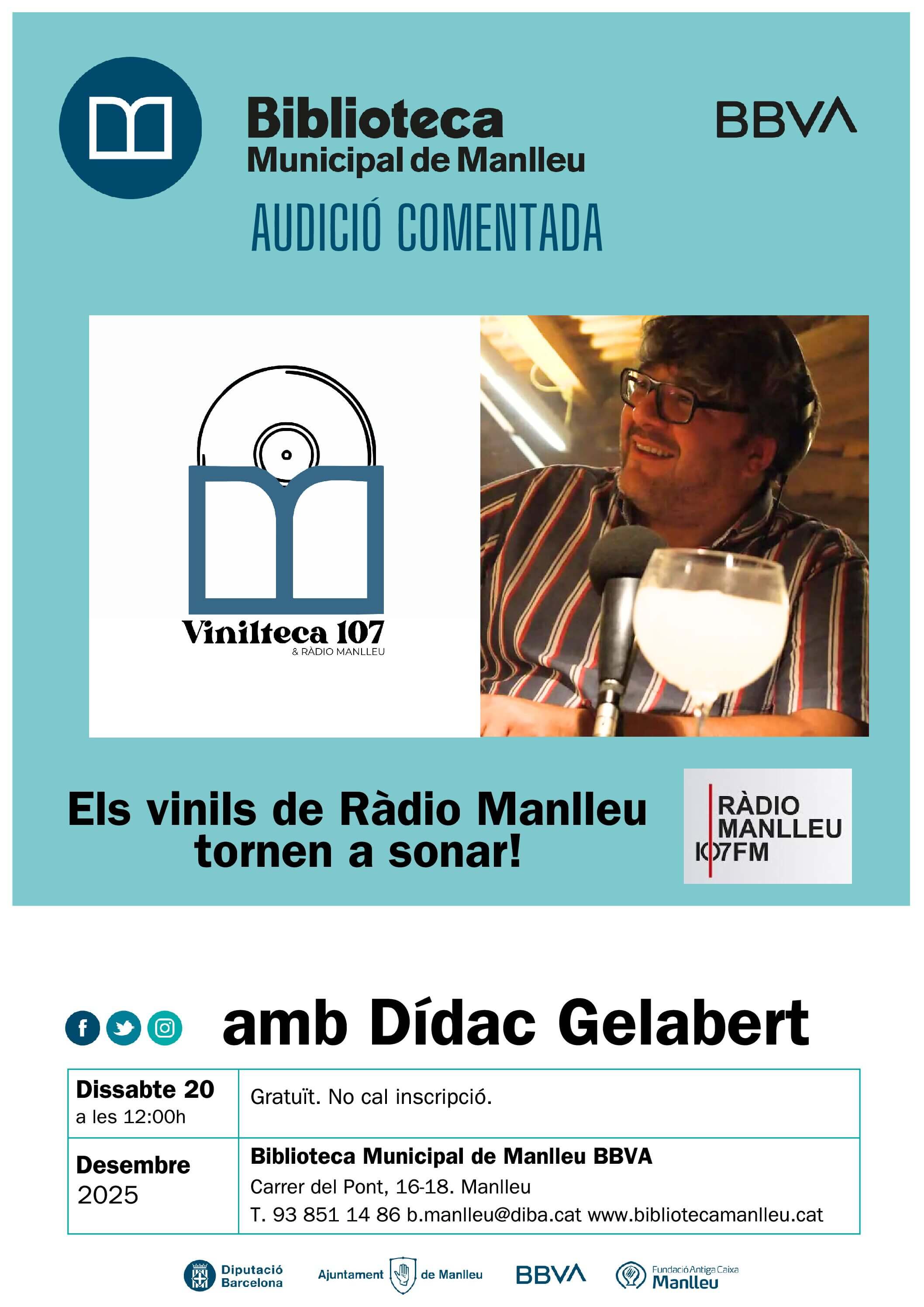El dissabte 20 de desembre, la Viniliteca 107 torna a la Biblioteca! Podrem gaudir d’una nova edició d’aquest cicle d’audicions comentades, on els antics DJs i locutors de Ràdio Manlleu ens guiaran a través dels vinils que van marcar una època. Conduït per Dídac Gelabert, aquest recorregut sonor ens farà reviure els temes més emblemàtics d’aquella època, mentre els presents podran escoltar anècdotes i històries sobre les cançons i els records d’aquells moments.