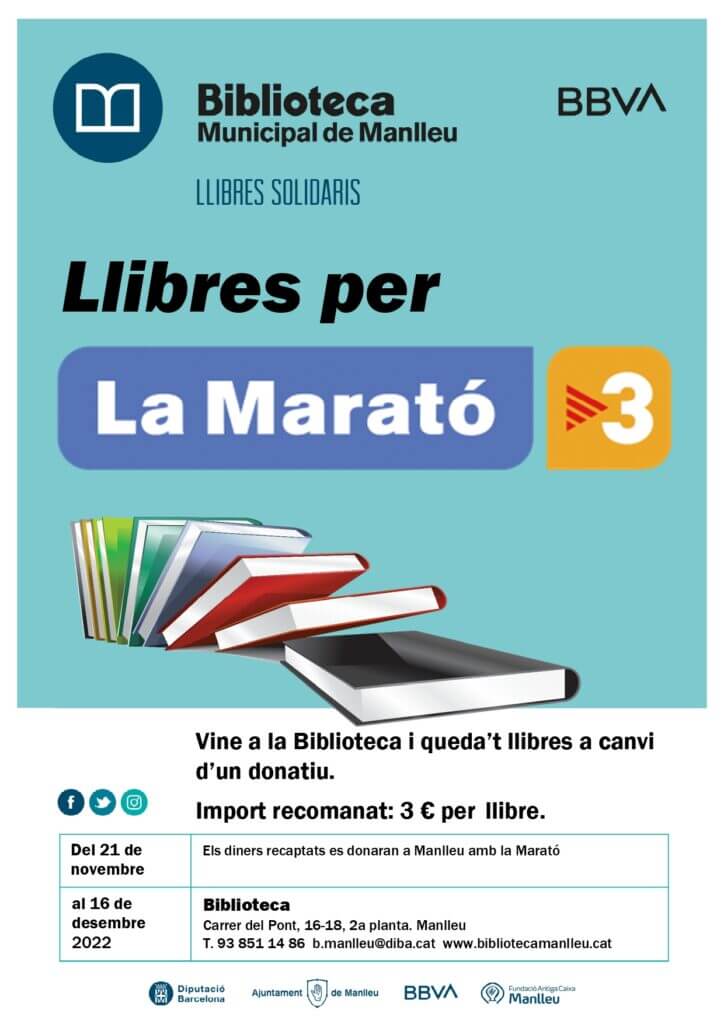 Vols fer un donatiu per la Marató? Vine a veure els llibres de la parada de la Biblioteca i queda’t els que vulguis a canvi d’un donatiu. Import recomanat: 3€ per llibre.