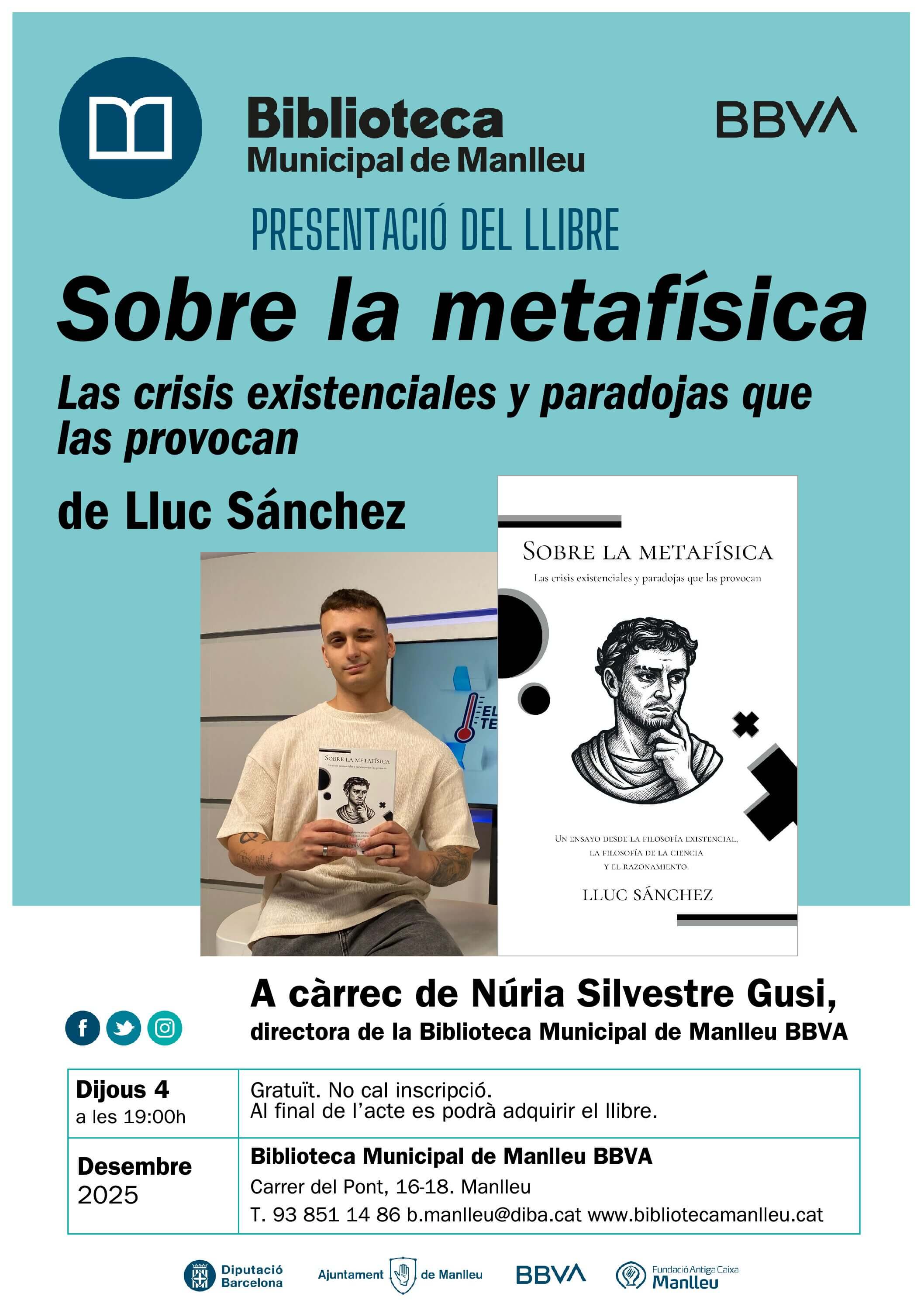La Biblioteca Municipal de Manlleu BBVA us convida a la presentació de Sobre la metafísica, las crisis existenciales y paradojas que las provocan, el primer llibre de l’autor jove Lluc Sánchez. A través d’aquesta obra, l’autor proposa una reflexió sobre les crisis existencials que sovint ens interpel·len i les paradoxes que es desprenen de les grans qüestions filosòfiques de l’existència humana.