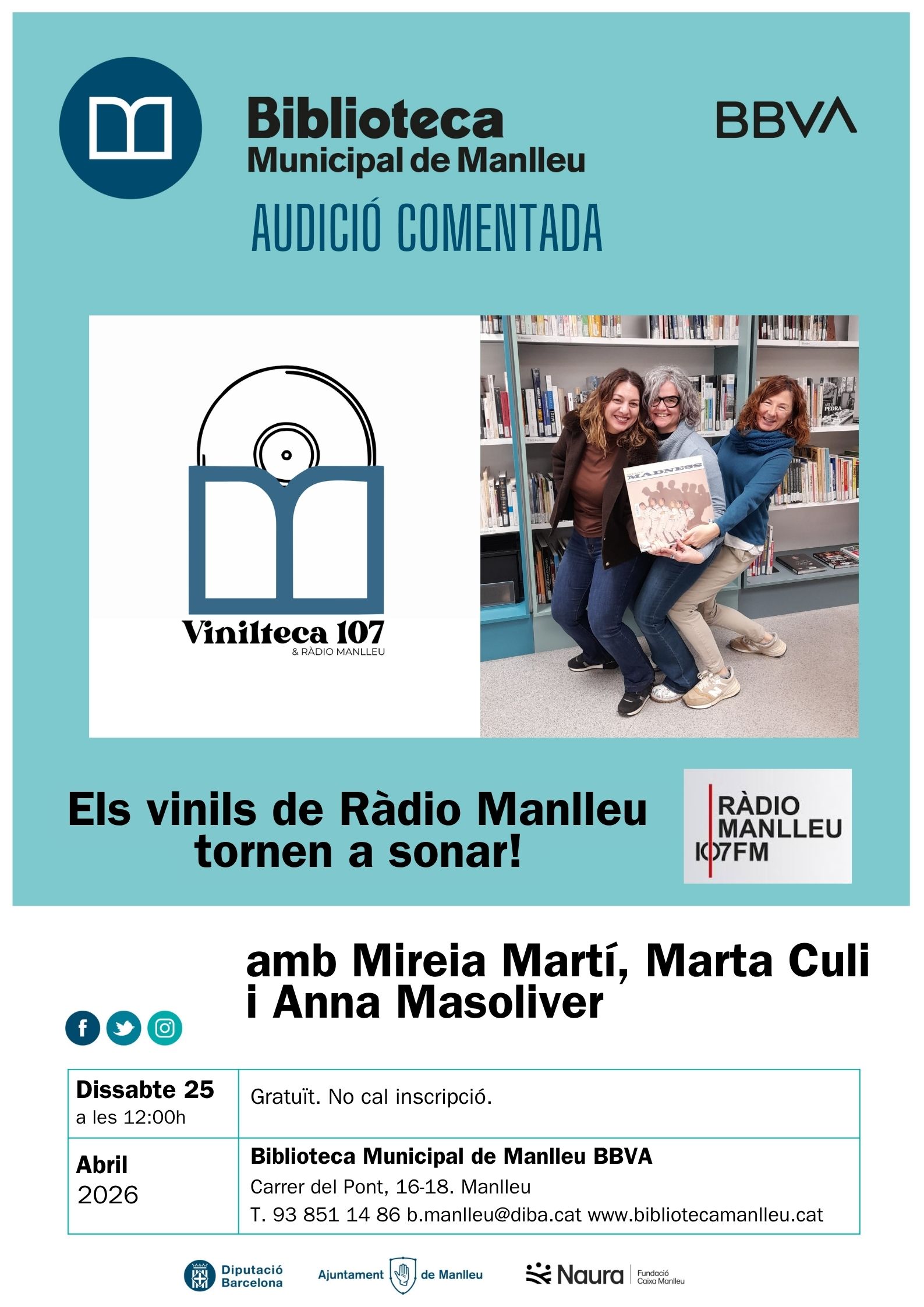 La música en vinil torna a omplir la Biblioteca Municipal de Manlleu! Aquest dissabte 25 d’abril de 2026 a les 12:00 h, tindrà lloc una audició comentada on els vinils més emblemàtics de Ràdio Manlleu sonaran de nou, oferint una experiència tant per als amants de la música com per a tots aquells que vulguin reviure la història de la ràdio local.