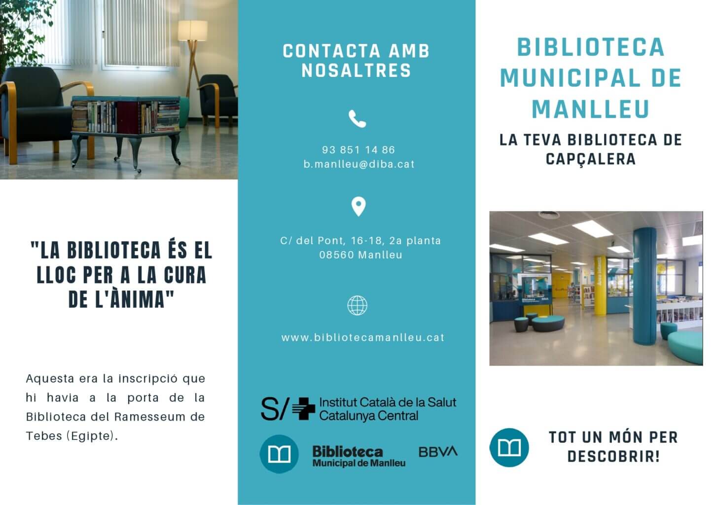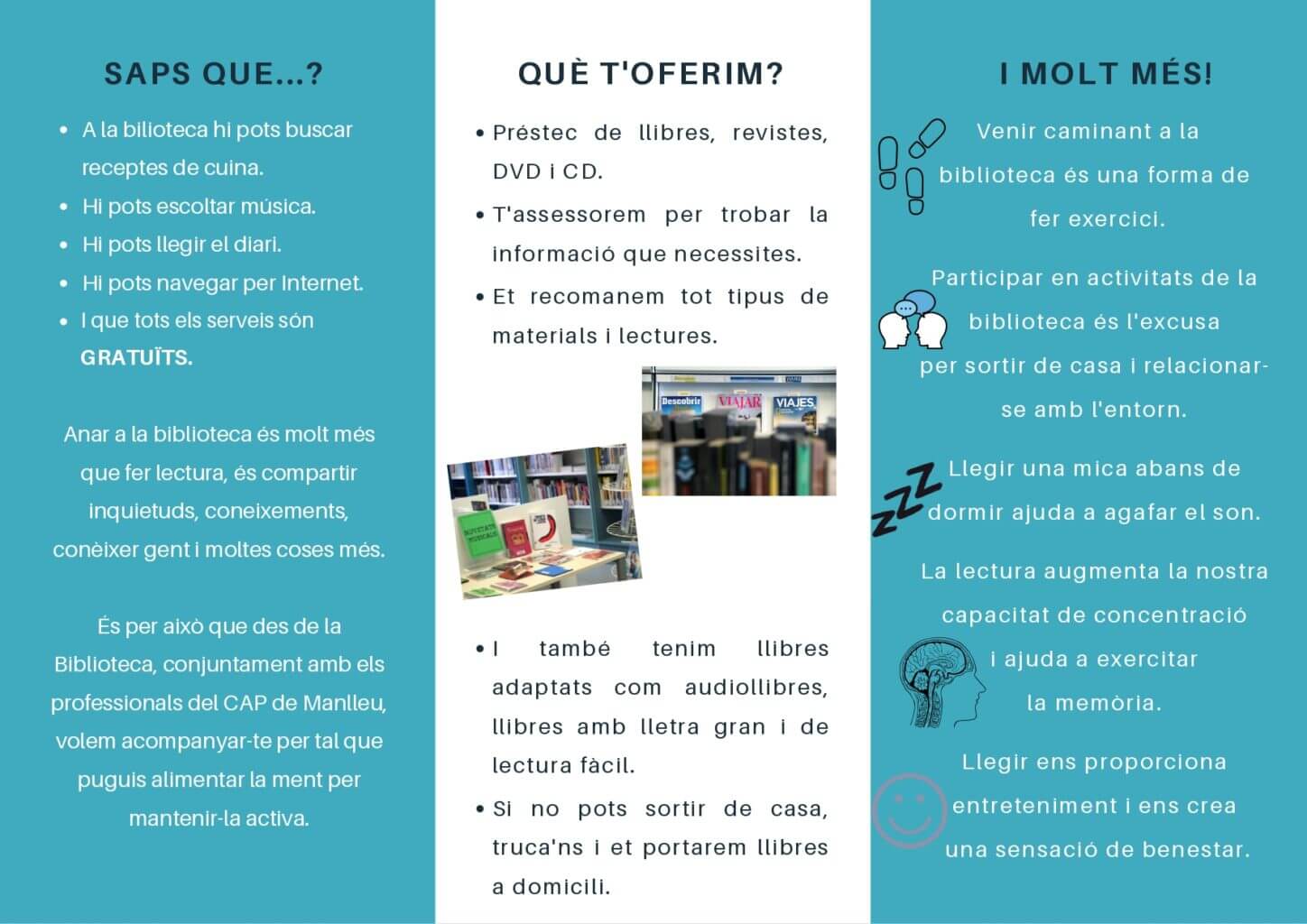 Des de la Biblioteca s’han preparat uns tríptics informatius sobre els diversos beneficis que aporta la lectura i la participació a activitats culturals en les persones. Un està destinat a públic adult i l’altre està pensat per al seu ús a pediatria, per a famílies amb fills petits. En els tríptics s’hi pot trobar tota la informació relacionada amb aquest projecte, què ofereix la Biblioteca, quins són els beneficis i hàbits saludables i molt més.