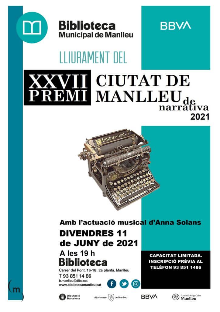 L’acte del veredicte i lliurament del XXVII Premi de Narrativa Ciutat de Manlleu 2021, serà el divendres 11 de juny, a les 19 h , a la Biblioteca Municipal de Manlleu BBVA. Carrer del Pont, 16-18 2a planta.