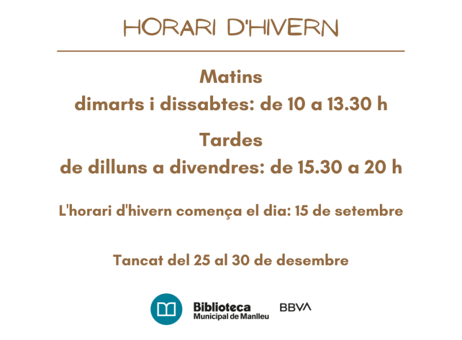 Escrit el 13 setembre 2023. ATENCIÓ: CANVI D’HORARI A partir del 15 de setembre, la Biblioteca canvia l’horari. Matins: dimarts i dissabte, de 10 a 13.30 h Tardes: de dilluns a divendres, de 15.30 a 20 h TANCAT DEL 25 AL 30 DE DESEMBRE Entrades anteriors Entrades següents