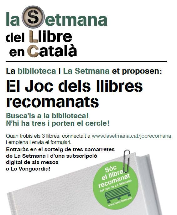 La biblioteca és ambaixadora de La Setmana del Llibre en català d’enguany i us proposem un joc. Cada 15 dies podeu trobar, tres llibres recomanats ben indicats amb un cercles de color verd. Vine a la Biblioteca i participa!